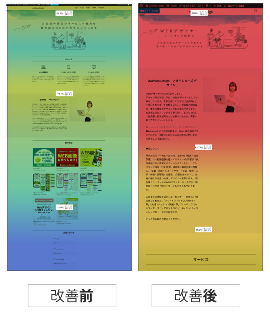 Webサイトは「作ったら終わり」ではなく、公開後にどれだけユーザー様にとって使いやすいかが成果を大きく左右します。ヒートマップ解析では、ユーザーの皆さまがどこに「注目」し、「迷い」、「離脱」しているのかを色と数値で可視化できます。実際の行動を基に分析することで、“なんとなく” や “感覚” ではなく、根拠のある改善が可能になります。私は、デザインの美しさだけでなく、ユーザー様がストレスなく目的にたどり着けるサイトづくりを大切にしています。ヒートマップで得られたデータをもとに、より使いやすく・成果につながる改善をご提案いたします。